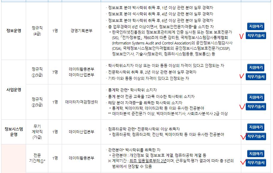 그럼 한국데이터산업진흥원 자소서 항목 가이드를 살펴보겠습니다. 본격적으로 자소서 항목들을 살펴보기 전에, 이번 채용 시에 어떤 분야로 지원을 할 것인지를 생각하고, 해당 분야의 직무기술서를 확인해주시기 바랍니다.