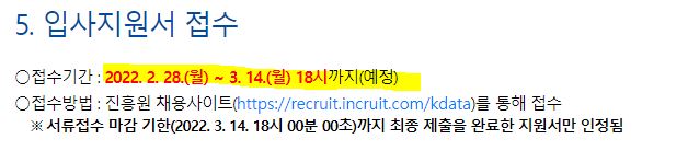 먼저, 한국데이터산업진흥원 입사 지원 일정부터 살펴보도록 하겠습니다. 현재 3.14 월요일 18:00까지 접수를 받고 있습니다. 당연한 소리지만, 임박해서 준비하는 것보다 미리 준비하는 것이 좋으니, 지금 바로 작성을 시작하지 않더라도 어떤 항목이 있고 어떤 식으로 내용을 준비할 것인지는 미리 생각을 해두면 좋을 것 같습니다.